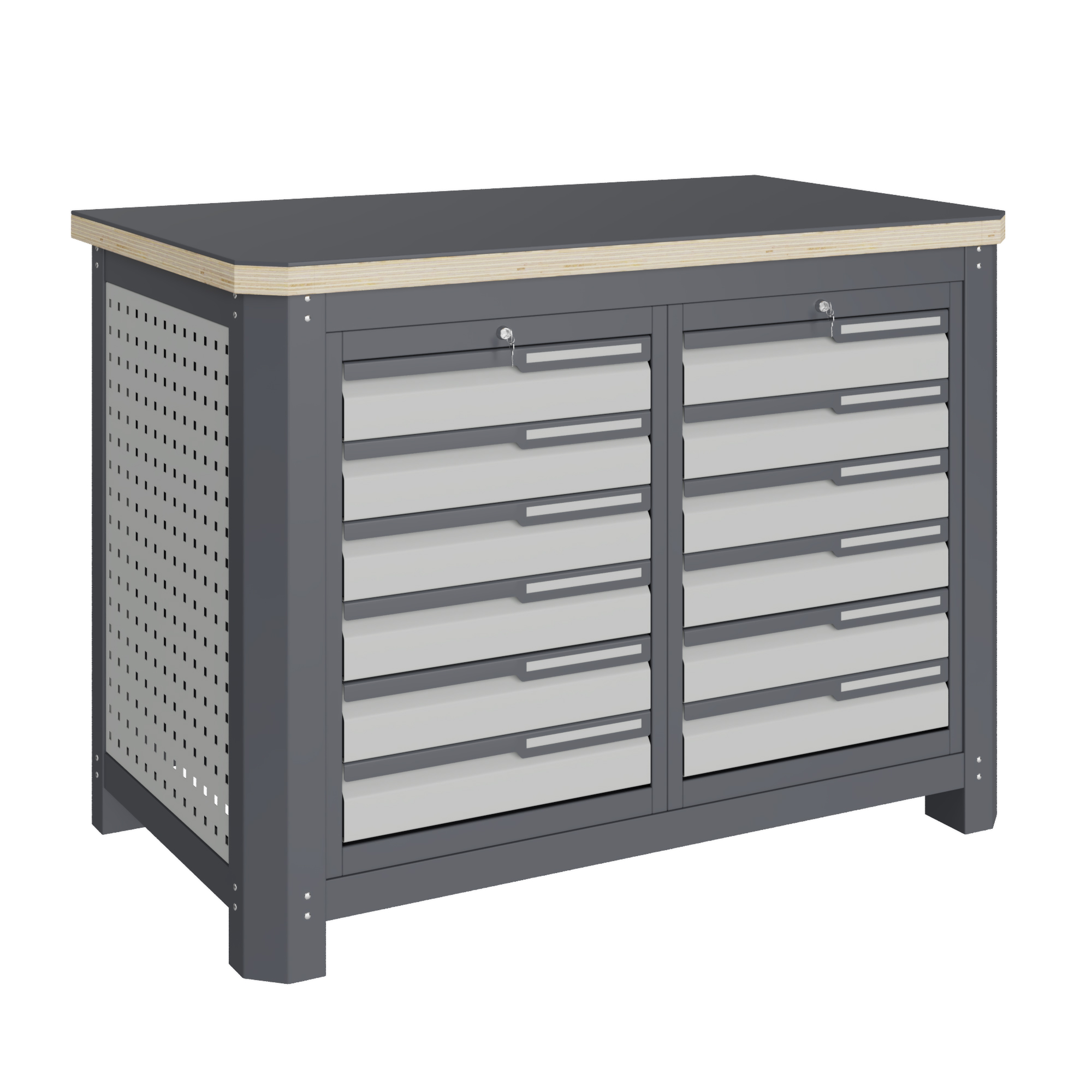 Модули верстака имеют сварную конструкцию из профилированной стали, каждый из которых запирается центральным ключевым замком.