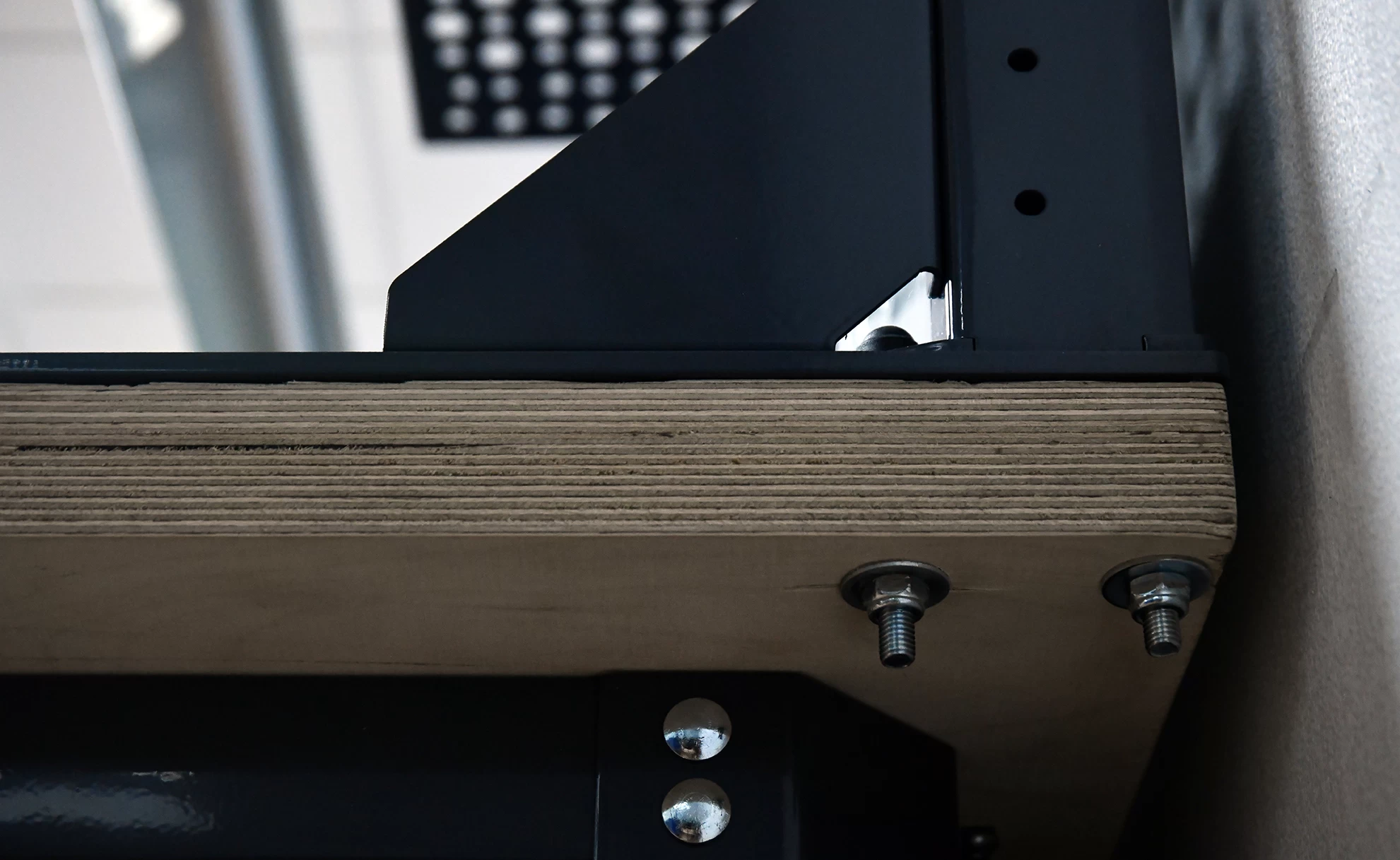 Несущий каркас верстака изготовлен из профилированной холоднокатаной стали высокой прочности, что придаёт ему особую устойчивость и позволяет выдерживать распределённую нагрузку до 1500 кг. Опоры допускают частичную регулировку по высоте, что делает возможным разместить верстак даже на неровном покрытии. Внутри опор установлены боковые перфорированные панели.