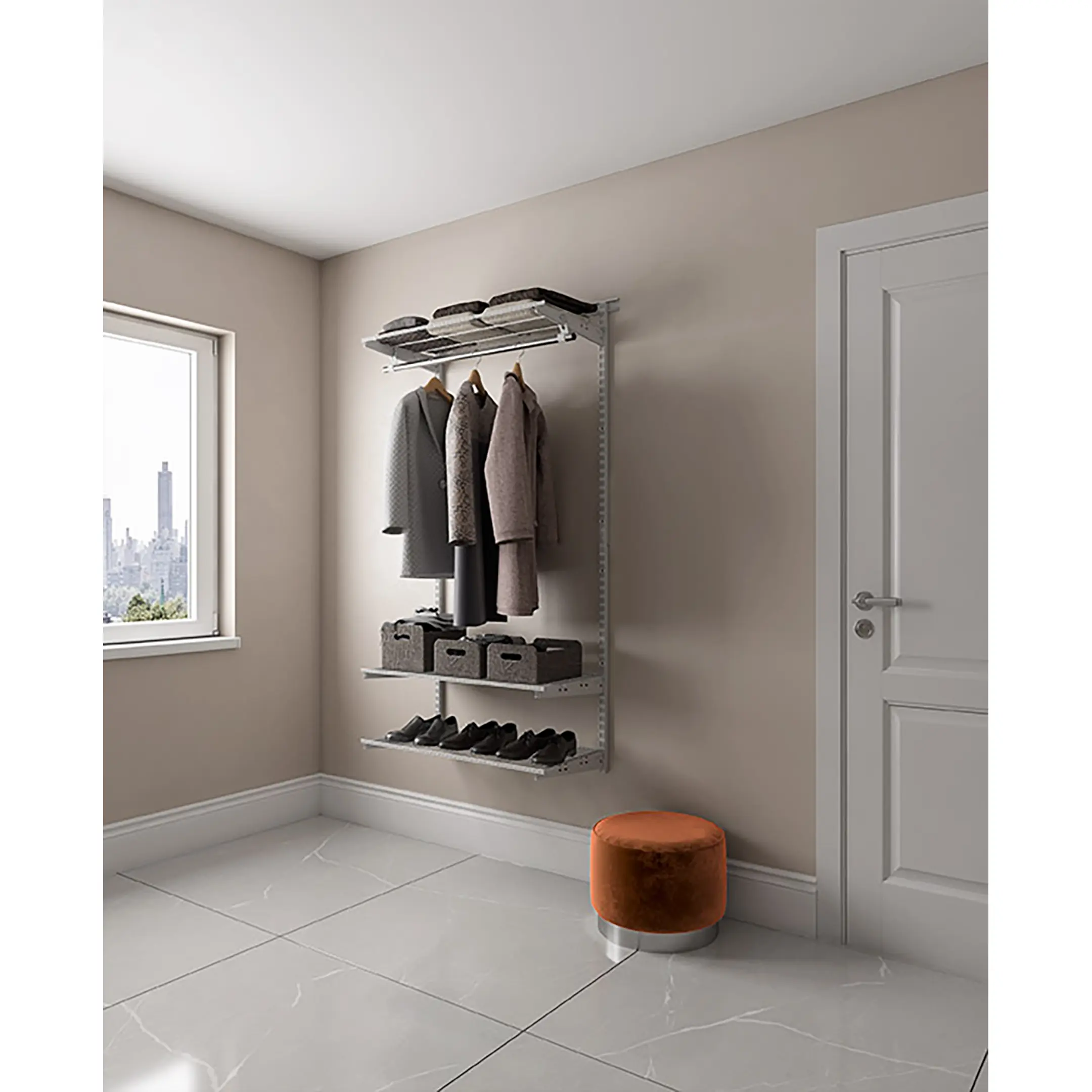 Среди её бесспорных преимуществ – фактор экологичности: открытая гардеробная система создаёт воздухообмен, исключая появление затхлости, повышенной влажности, неприятных запахов. В ней не заводится плесень, не копится пыль. Важна и визуальная открытость: гардеробная система с сетчатыми полками позволяет сразу увидеть нужный предмет, не тратя время на его разыскивание в недрах обычного шкафа.